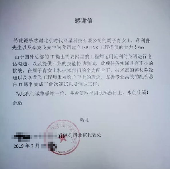 近日,時(shí)代網(wǎng)星再次收到客戶的表揚(yáng)信。公司的三位員工在為某外資金融客戶服務(wù)時(shí),不僅提供了專業(yè)的技術(shù)服務(wù),而且與客戶的國外總部進(jìn)行耐心細(xì)致的溝通,圓滿完成了IT調(diào)試和施工工作。