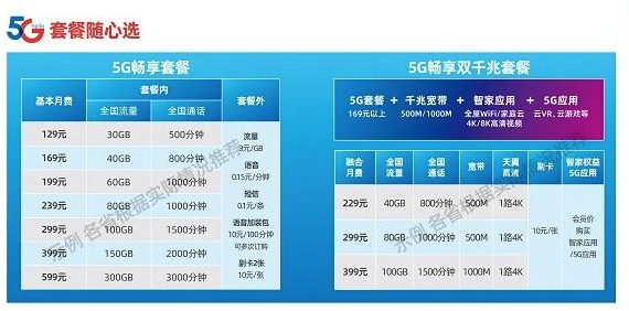 在5G暢享套餐上,129元檔包含30GB全國流量和500分鐘全國通話;